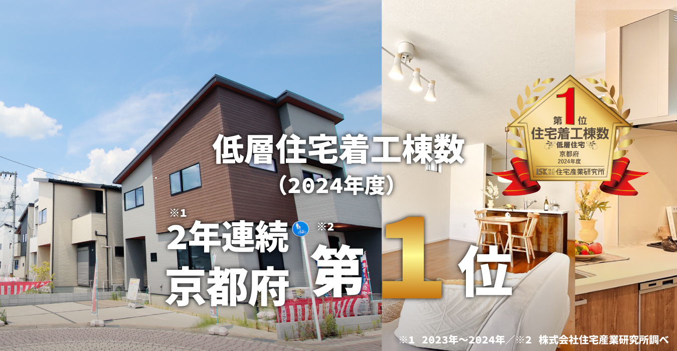 おかげさまで、2年連続(2023年度~2024年度)京都府における低層住宅着工棟数で第1位を達成いたしました。今後もさらに多くのお客様にご満足いただけるよう、事業エリアの拡大を計画するとともに、商品力やコスト競争力のさらなる強化に努めてまいります。