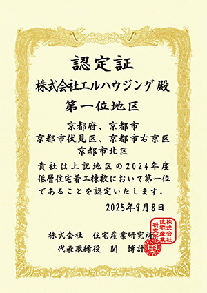 エルハウジングが2年連続(2023年度~2024年度) 都道府県別 住宅着工棟数シェア「京都府No.1」に輝きました!※